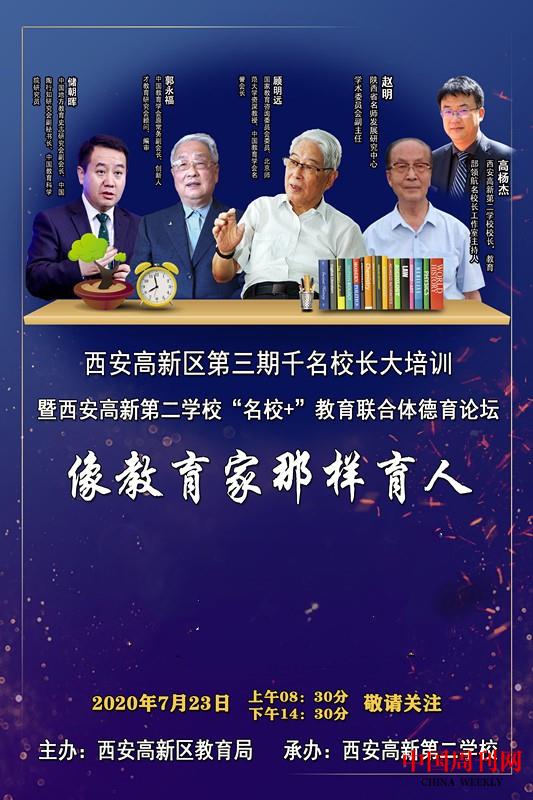 ——西安高新區(qū)第三期千名校長大培訓(xùn)暨西安高新第二學(xué)?!懊?”教育聯(lián)合體德育論壇紀(jì)實(shí)報(bào)道2020年是西安市基礎(chǔ)教育提升三年行動(dòng)計(jì)劃的重要一年,也是高新區(qū)實(shí)施“1346”計(jì)劃爭當(dāng)教育強(qiáng)市先行示范區(qū)的攻堅(jiān)之年。7月23日,由高新區(qū)教育局主辦,西安高新第二學(xué)校承辦的“像教育家那樣育人”西安高新區(qū)第三期千名校長大培訓(xùn)暨西安高新第二學(xué)校“名校+”教育聯(lián)合體第六屆德育論壇開展了線上直播,活