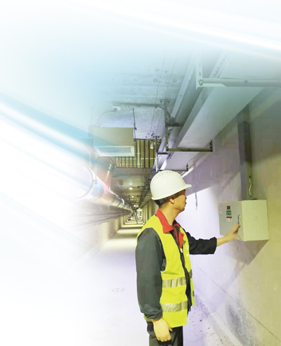 巡檢正式開始,首先進入的是水艙,高約2.8米、寬約3米,兩側(cè)分別是自來水管和再生水管。往前走了一會兒,出現(xiàn)一個扶梯,劉冬起爬了上去,“這里是設(shè)備夾層,布置了部分通風和電氣設(shè)備,每次都需要爬上來看看是否運行正常?!庇幸换?,他發(fā)現(xiàn)應急照明柜里的電池過熱,幸好及時處理,避免了潛在的安全隱患。