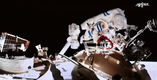 航天員劉伯明身著新一代“飛天”艙外服出艙。