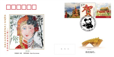 中國(guó)—俄羅斯紀(jì)念封以中俄藝術(shù)家合作的油畫《和美》為主圖,展示了一位美麗少女的形象。少女一半是中國(guó)面孔,身著典型戲劇裝扮,背景是代表中國(guó)特色的挺拔翠竹;另一半是俄羅斯面孔,身著俄羅斯傳統(tǒng)服飾,背景是代表俄羅斯風(fēng)情的亭亭白樺。