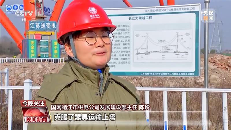 國網(wǎng)靖江市供電公司發(fā)展建設(shè)部主任 陳玲:(長江大跨越工程)施工過程中克服了器具運輸上塔、跨江2200多米封航放線等難題,創(chuàng)造了桿塔高度、鐵塔根開、抱桿高度和地腳螺栓重量等五個世界第一。