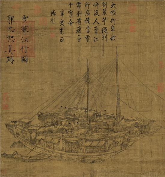 《雪霽江行圖》是五代宋初的郭忠恕創(chuàng)作的立軸絹本設色畫,現藏于臺北故宮博物院。本圖描繪雪霽以后兩艘巨型樓船在江邊行進,船的結構與船上的物件描寫詳盡而嚴謹,還穿插水手及一些人物的活動,情節(jié)生動。無數印,上方有宋徽宗趙佶題“雪霽江行圖,郭忠恕真跡”10字。據考證,該圖原為長卷,后被割裂,本圖為原長卷中之一段。畫上有宋徽宗題“雪霽江行圖郭忠恕真跡”十字,上鈐“御書之寶”一璽。圖經宋內府及清梁清標鑒藏,《石渠寶笈續(xù)編》著錄。上有“蕉林秘玩”印和清乾隆、嘉慶諸璽及乾隆題詩。