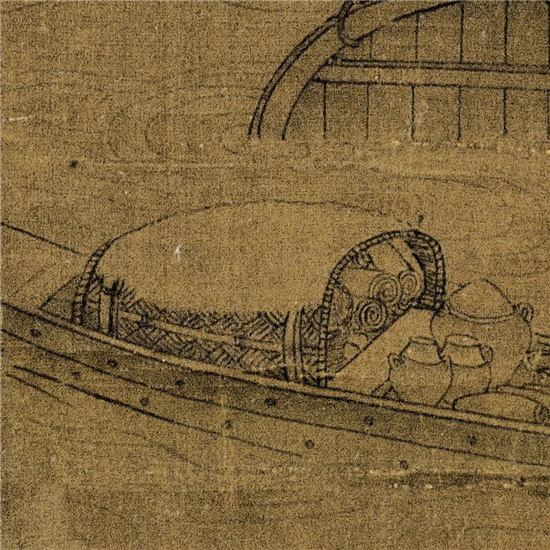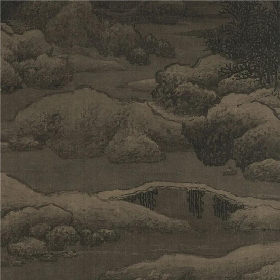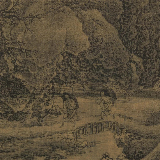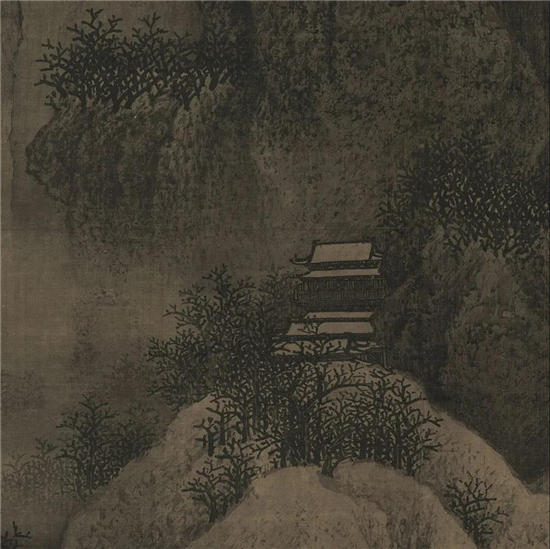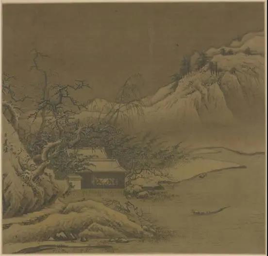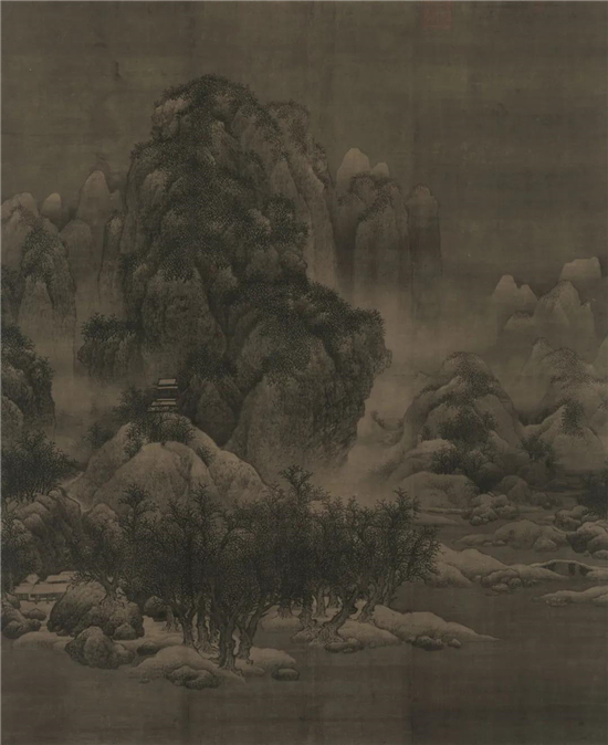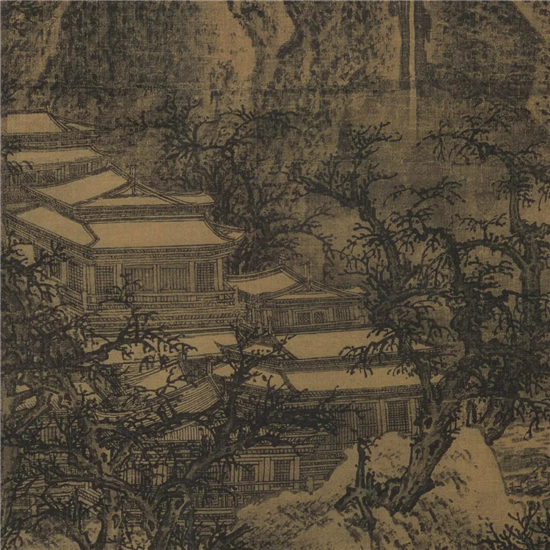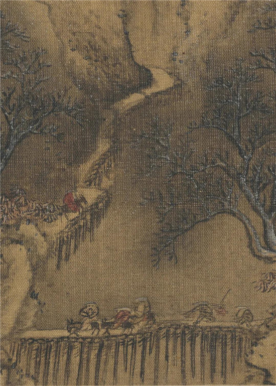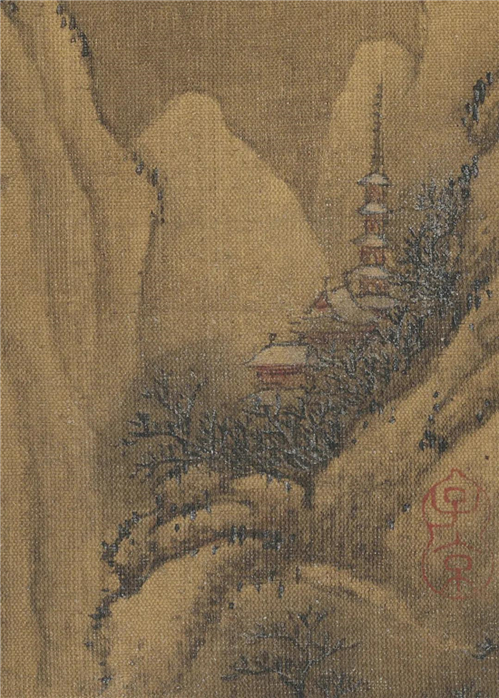 《雪山樓閣圖》,現藏于波士頓美術館。此畫與《溪山行旅圖》中的商旅有異曲同工之妙,左下漁夫賣魚,山間小路上的行人冒匆匆趕路,山腰間樓閣殿宇隱現。此畫皴法多是雨點皴,畫中景抽繪樹木,用筆遒勁,姿態(tài)各異,為畫面平添生氣。近處的柏樹,筆法極其精彩。主峰作寒林密布,如茸似毯,密而不亂。是一幅非常優(yōu)秀的宋代精品。