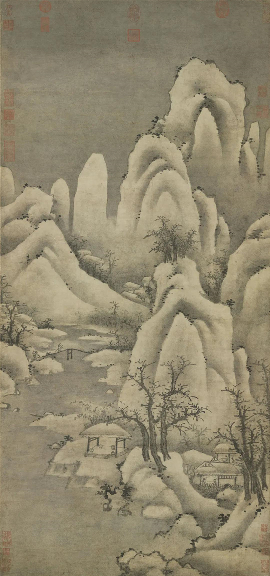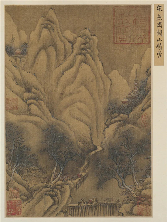 《關山積雪圖》為北宋燕肅所繪,現藏于故宮博物院?!蛾P山積雪圖》是極具寫意色彩的雪景畫,置陳獨特,一條山間棧道延伸向前,消失在崇山之中,給人以深遠的景觀感。畫中群山白雪皚皚,山坡樹木之上的留白,道出深冬的景象,近景的茅廬,遠景的關樓、古寺點綴其中,分層有致。仔細觀看,山腳下的棧道由一根根的木樁支撐著,與山體的堅實相比,顯得顫顫巍巍,加上雪天路滑,真是替行在其上的一隊人馬捏一把汗,令觀者心懸。一位紅衣人先群騎行,這種處理方法使此人物在天地之間格外突出,獨自行走于這凈潔幽深之境,天地無邊靜穆,但給人以靜穆里找到自己獨特的存在,頓生“孤高拔俗”之感。