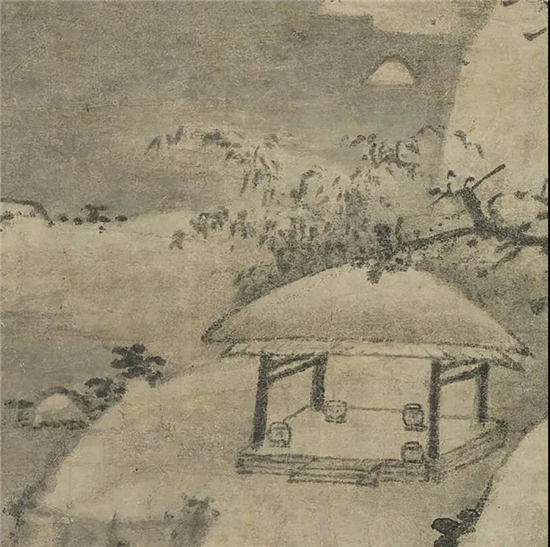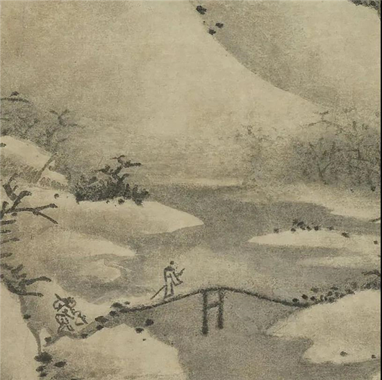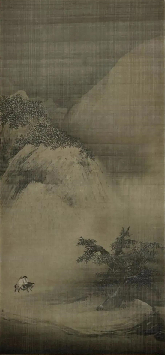 《雪景山水圖》梁楷繪,現藏于東京國立博物院?!堆┚吧剿畧D》堪稱南宋院體山水畫的經典之作。圖中描繪兩個身著白色披風、頭戴風雪帽的騎驢人穿行山谷的情景。水邊兩棵老樹,其虬曲的枝干和稀疏的樹葉,是以細致的筆法刻畫出來的。畫山石,仿北宋范寬的筆法,以簇點畫密林;而山體皴筆甚少,在以淡墨渲染的天空的映襯下,給人以白雪皚皚之感。整個畫面呈現出荒涼蕭瑟的氛圍。在畫幅左下角寒溪邊緣有“梁楷”的落款。