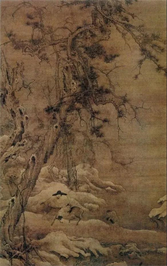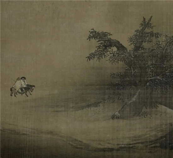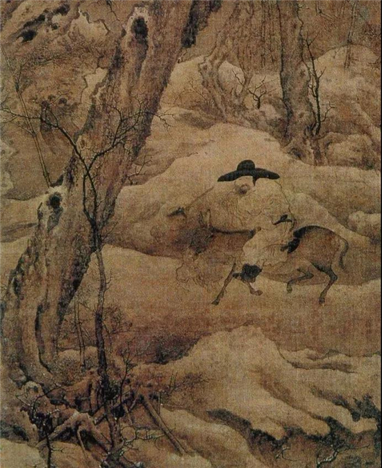李成的《寒林騎驢圖》是宋畫中罕見的大立軸。畫的是白雪寒冬,長松之下,一文人騎驢行于郊野,前后有童仆相隨。畫面只有近景和中景,遠景則掩于古松之后,未著一筆,卻氣象蕭瑟,境界幽深。在刻意營造的荒寒冷寂中,卻有嫩枝環(huán)繞蒼松,嚴寒之下仿佛孕育著無限生機?,F藏于美國大都會藝術博物館。