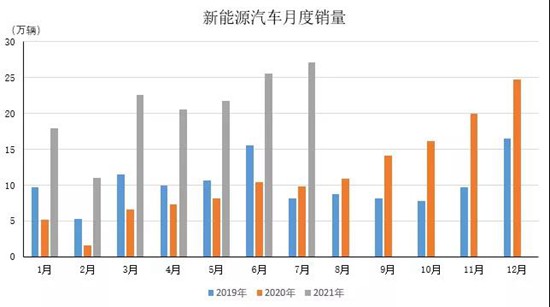統(tǒng)計(jì)數(shù)據(jù)顯示,今年7月,新能源汽車產(chǎn)銷分別達(dá)到28.4萬(wàn)輛和27.1萬(wàn)輛,市場(chǎng)呈現(xiàn)出“淡季不淡”的特點(diǎn),產(chǎn)銷環(huán)比和同比繼續(xù)保持增長(zhǎng),且雙雙創(chuàng)歷史新高。考慮到通常下半年才是新能源汽車銷售的旺季,2021年新能源汽車銷量有極大的概率超出市場(chǎng)預(yù)期。