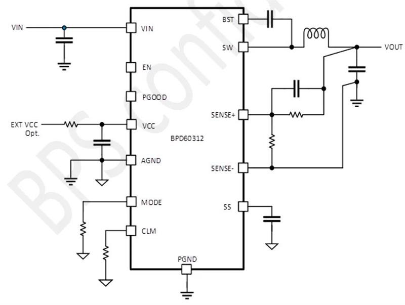 上海晶豐明源的DC-DC芯片BPD60312支持者也非常多,它是一款集成同步降壓轉(zhuǎn)換器,支持2.7V~16V的輸入電壓,輸出支持12A直流負(fù)載。芯片采用了低靜態(tài)電流方案,在輕負(fù)荷下節(jié)省功耗。為了滿足不同的應(yīng)用要求,芯片允許用戶調(diào)整MODE引腳對地電阻來設(shè)置開關(guān)頻率,CCM/DCM模式選項(xiàng)和內(nèi)部LDO輸出。SENSE+ 和SENSE- 引腳的遠(yuǎn)端監(jiān)測功能,可以幫助芯片實(shí)現(xiàn)更精確的輸出監(jiān)控。此外,芯片還提供了一個(gè)可靈活設(shè)置的軟啟動計(jì)時(shí)器。