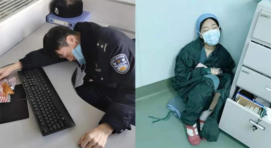 看到這張照片,我就想起手機里還存著一張愛人類似的照片,因為日夜連軸轉,她蜷在角落里打個盹就睡著了,一個患者看到這一幕,拿起手機留下了這個瞬間。這張照片一直存在我手機里,我很心疼照片里的她。我們倆總用這個照片勉勵對方,而這次戰(zhàn)“疫”也讓我們更加珍惜彼此,更加愛對方,更加珍惜現(xiàn)在所擁有的一切。