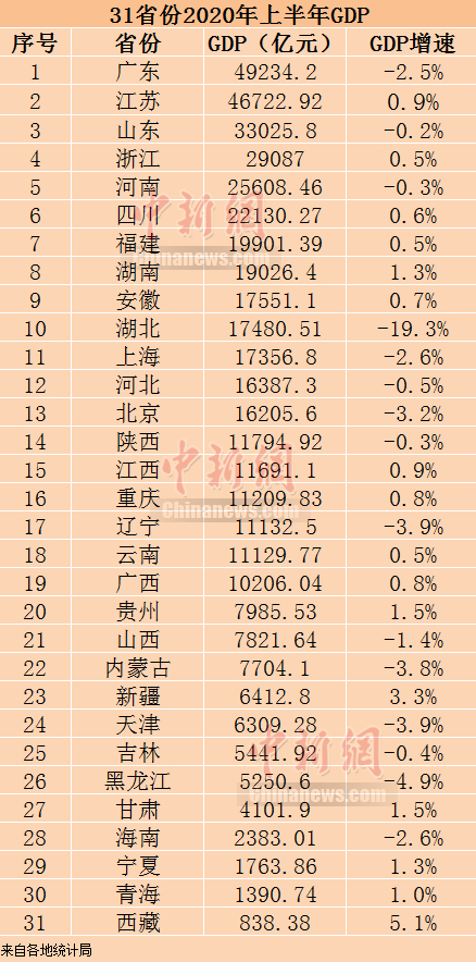 中新網(wǎng)客戶端7月29日電 (李金磊) 隨著黑龍江28日發(fā)布上半年經(jīng)濟數(shù)據(jù),全國31省份上半年GDP數(shù)據(jù)全部出爐。從GDP總量來看,前三強依然是廣東(49234.20億元)、江蘇(46722.92億元)、山東(33025.8億元),不過江蘇跟廣東的GDP差距明顯縮小。從GDP增速來看,有16個省份是正增長,15省份實現(xiàn)由負轉正。西藏以5.1%的增速居全國第一位。