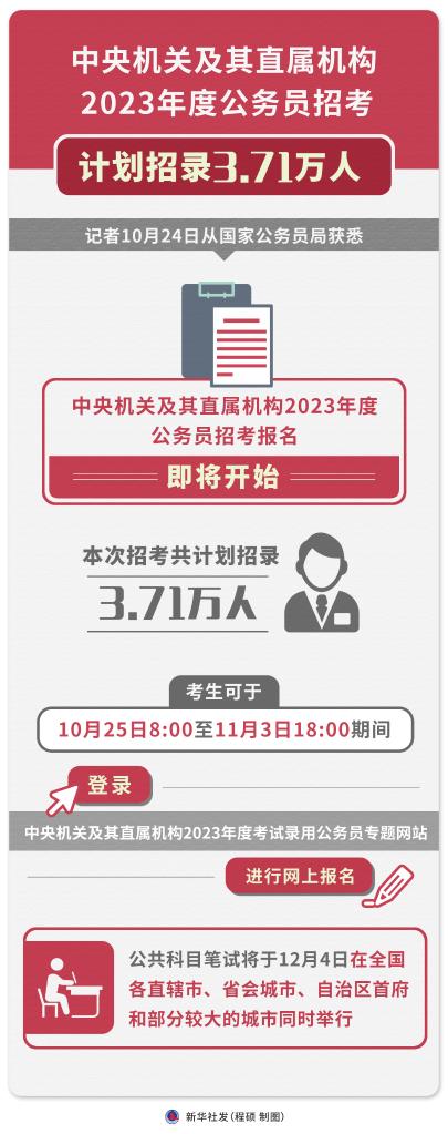新華社北京10月24日電 記者24日從國家公務(wù)員局獲悉,中央機(jī)關(guān)及其直屬機(jī)構(gòu)2023年度公務(wù)員招考報名即將開始。本次招考共計劃招錄3.71萬人。