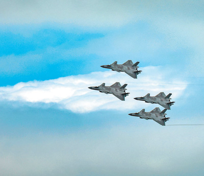 殲—20戰(zhàn)機四機編隊進行飛行展示。