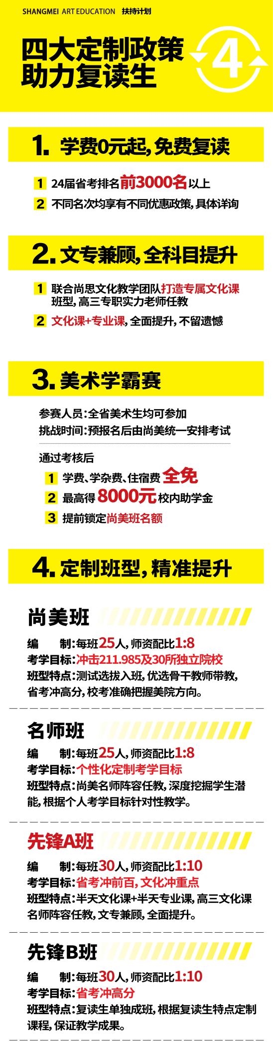 此外,該校還專門針對復讀學生制定了專項扶持計劃,2024年度全省省考排名前3000名學生免費學費,為復讀學生打造專屬文化課體系,文專兼顧,全科目提升,還有美術學霸賽、尚美定制班型等一系列扶持政策,助力復讀生更好學習提升。