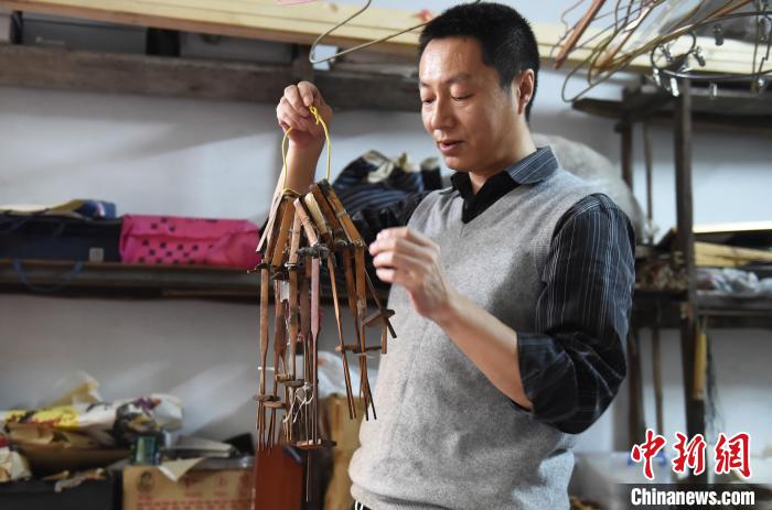 圖為李開軍展示制作榮昌折扇的部分工具?!≈芤?攝