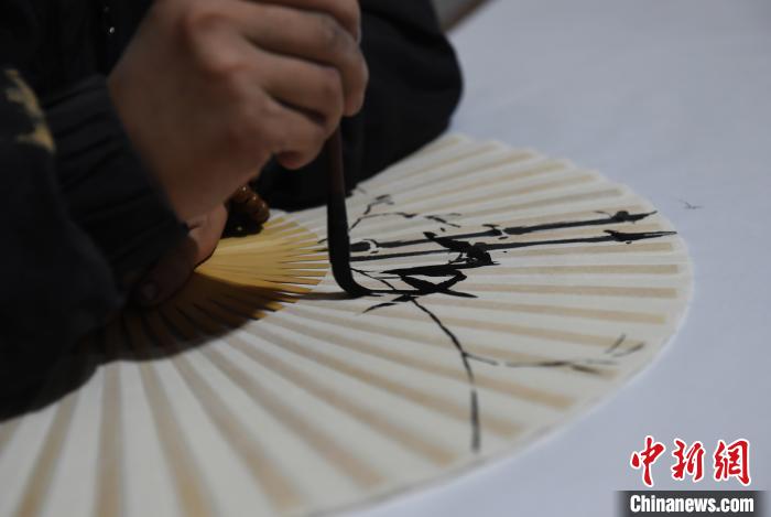 圖為畫師正在為成品榮昌折扇進(jìn)行繪畫修飾?!≈芤?攝