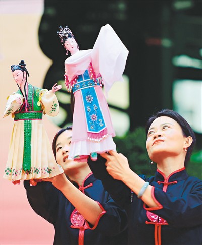 演員在活動(dòng)現(xiàn)場(chǎng)表演晉江木偶劇團(tuán)的傳統(tǒng)小戲《掌上情緣》。 |