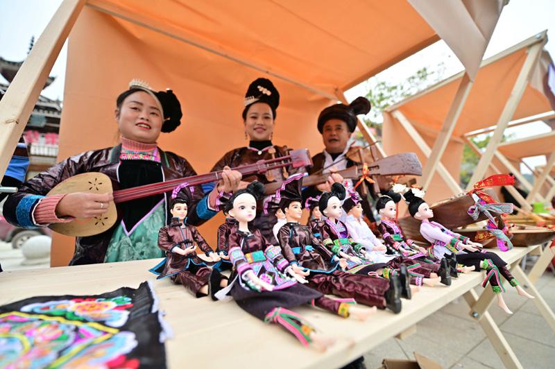 11月29日,侗族琵琶歌藝人在貴州省從江縣周末非遺扶貧集市上一邊展銷非遺產(chǎn)品,一邊表演侗族琵琶歌。新華社發(fā)(吳德軍 攝)