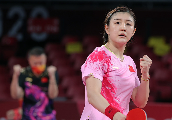 7月28日,在東京奧運(yùn)會(huì)乒乓球女單四分之一決賽中,中國選手陳夢戰(zhàn)勝中國香港選手杜凱琹,晉級半決賽。新華社記者 王東震 攝