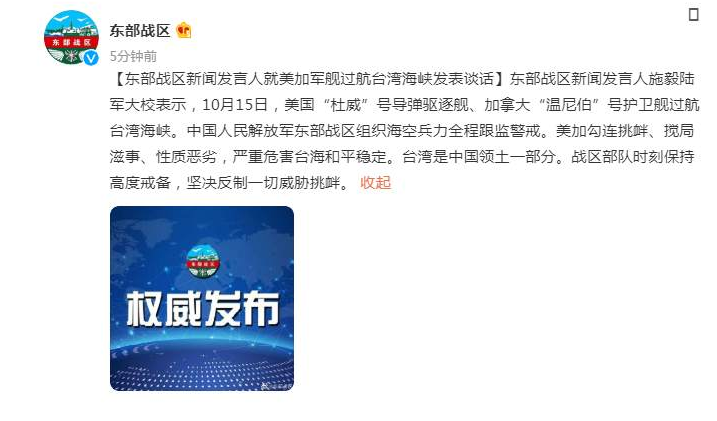 東部戰(zhàn)區(qū)新聞發(fā)言人施毅陸軍大校表示,10月15日,美國“杜威”號(hào)導(dǎo)彈驅(qū)逐艦、加拿大“溫尼伯”號(hào)護(hù)衛(wèi)艦過航臺(tái)灣海峽。中國人民解放軍東部戰(zhàn)區(qū)組織??毡θ谈O(jiān)警戒。美加勾連挑釁、攪局滋事、性質(zhì)惡劣,嚴(yán)重危害臺(tái)海和平穩(wěn)定。臺(tái)灣是中國領(lǐng)土一部分。戰(zhàn)區(qū)部隊(duì)時(shí)刻保持高度戒備,堅(jiān)決反制一切威脅挑釁。