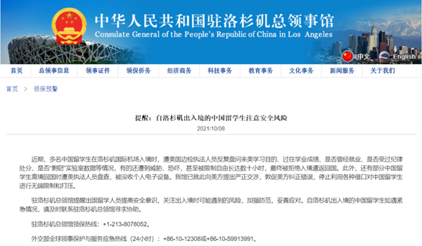 中國留學(xué)生入境美國遭恐嚇 我駐洛杉磯總領(lǐng)館發(fā)布提醒