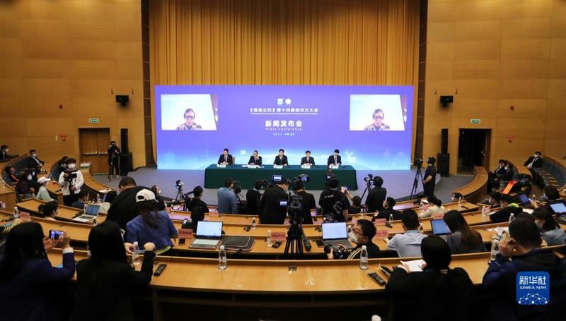 這是11月6日在湖北武漢拍攝的《濕地公約》第十四屆締約方大會(huì)新聞發(fā)布會(huì)現(xiàn)場(chǎng)。新華社記者 孫瑞博 攝