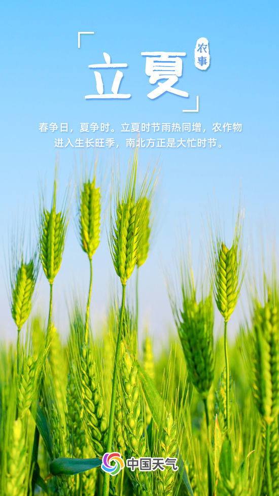 如果說春是生的季節(jié),那么夏就是長的季節(jié)?!稓v書》曰:“斗指東南,維為立夏,萬物至此皆長大,故名立夏也?!绷⑾?,是標(biāo)示萬物進(jìn)入旺季生長的一個(gè)重要節(jié)氣。此時(shí),日照增加、氣溫漸升、雷雨增多,農(nóng)作物進(jìn)入了茁壯成長階段。春播作物漸漸長大,夏收作物進(jìn)入生長后期,冬小麥揚(yáng)花灌漿,油菜接近成熟,大江南北都進(jìn)入了農(nóng)事繁忙時(shí)期。