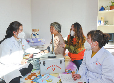 ??甘肅省定西市通渭縣義崗川鎮(zhèn)東南村,鎮(zhèn)村簽約醫(yī)師和駐村干部志愿者一道進村入戶為老人進行身體檢查。張子斌攝(影像中國)