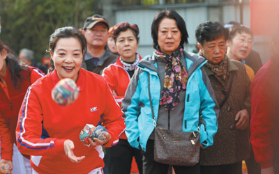 ??湖北省襄陽市老年大學運動會上,運動員在進行投沙包比賽。楊 東攝(影像中國)