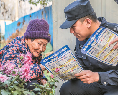 ??安徽省馬鞍山市和縣公安局善厚派出所民警向老年人開展防范養(yǎng)老詐騙宣傳活動。楊杉杉攝(影像中國)