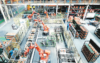 在江蘇蘇州明志科技有限公司砂芯智能化車間,機(jī)器人正在制造產(chǎn)品。