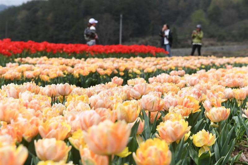 3月28日,游客在烏漿村鮮花基地觀賞郁金香。新華社記者翁忻旸 攝