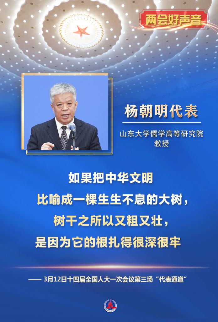 山東大學(xué)儒學(xué)高等研究院教授楊朝明代表講述了從事中國(guó)傳統(tǒng)文化研究的體會(huì)。“如果把中華文明比喻成一棵生生不息的大樹(shù),樹(shù)干之所以又粗又壯,是因?yàn)樗母煤苌詈芾?。這是我們中華民族的突出優(yōu)勢(shì)之一,是我們深厚的文化軟實(shí)力。”
