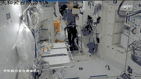 神舟十三號(hào)乘組認(rèn)真健身的畫面