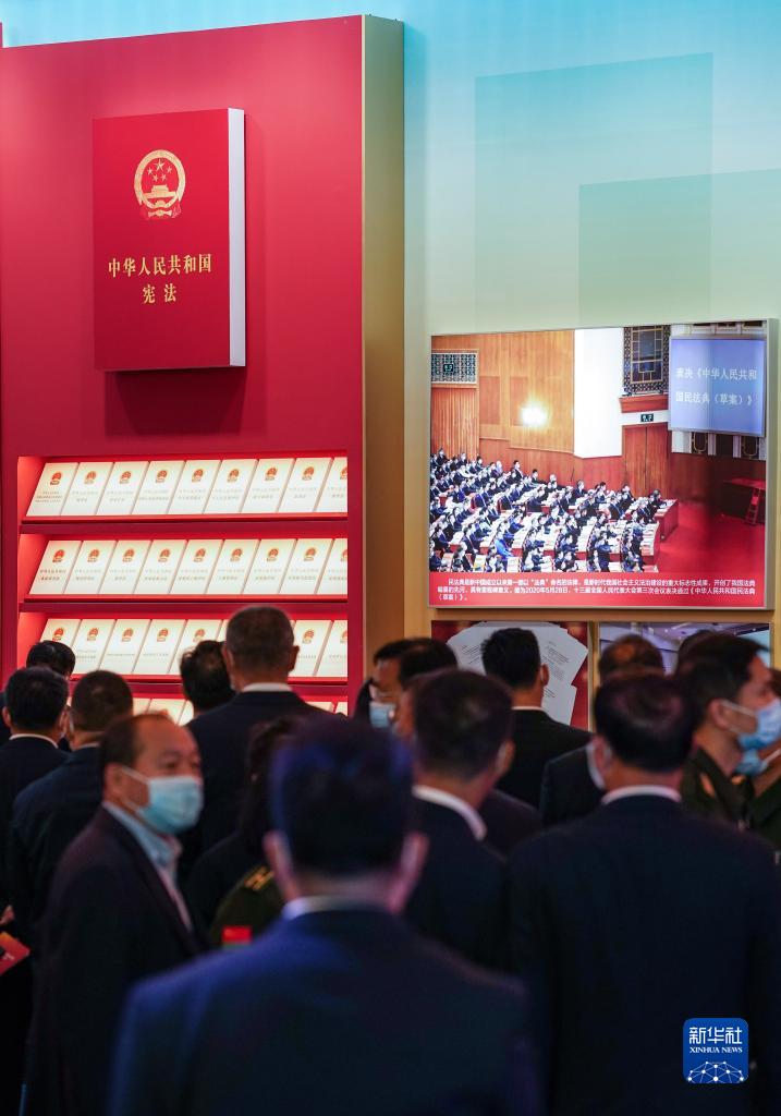 莊重肅穆的法律展示區(qū),大幅憲法圖標(biāo)居于最高位置,黨的十八大以來新制定的部分法律法規(guī)依次陳列,象征著以憲法為核心的中國特色社會(huì)主義法律體系不斷完善。