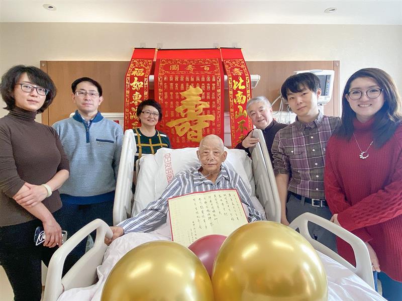 2021年2月12日,辛育齡在北京中日友好醫(yī)院慶祝百歲生日,與家人合影。新華社發(fā)(蔡瑩瑩 攝)