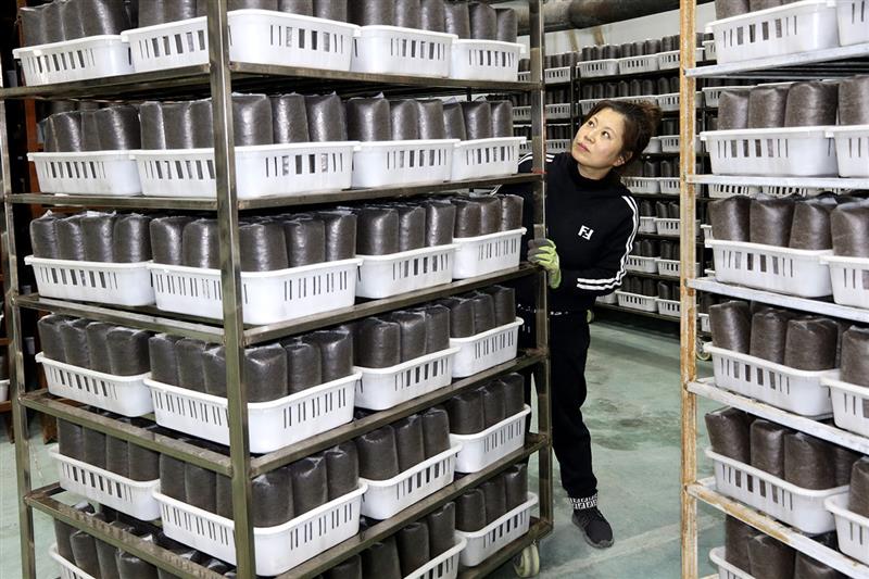 在黑龍江省寶清縣寶清鎮(zhèn)雙泉村的食用菌基地,食用菌種植專業(yè)合作社理事長鞠秀芹查看菌包(4月16日攝)。新華社發(fā)