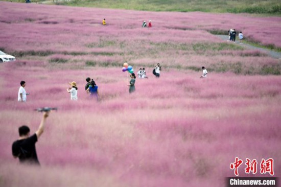圖為:游客在安徽省合肥之源景觀帶觀賞粉黛亂子草?!№n蘇原 攝