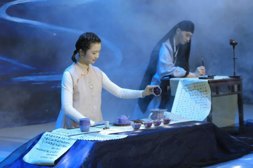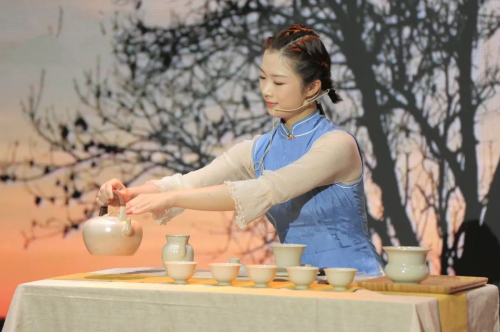 半決賽“茶中詩意長”環(huán)節(jié),整茶席大膽創(chuàng)新,把茶藝戲劇化,用色彩鮮艷的【問鼎鈞瓷】搭配故事《牡丹亭》的舞臺。