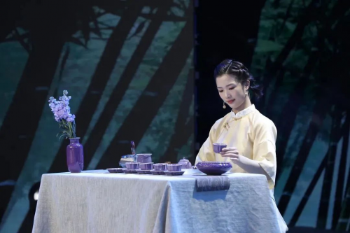一席靛藍茶席,一套紫色鈞瓷茶器,撞色設計搭配與茶席相融相契,整個表演現場穿越了回憶進入最忘情忘境的世界。