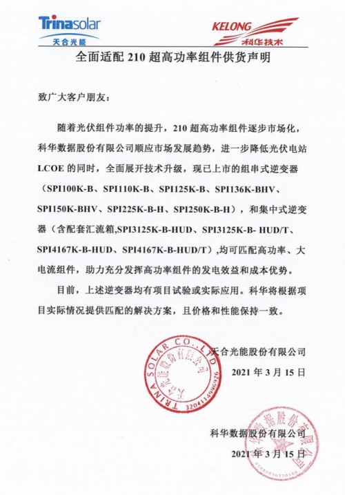 在光伏領(lǐng)域,科華光伏逆變器解決方案以高可靠、高性能、高適配的特點(diǎn)以及核島級品質(zhì),打造了一系列標(biāo)桿項(xiàng)目,積累了全球累計(jì)裝機(jī)量13GW。近日,公司正式宣布旗下逆變器產(chǎn)品全面適配210組件且可批量出貨,成為當(dāng)前大電流逆變器產(chǎn)品線最全的企業(yè)之一。