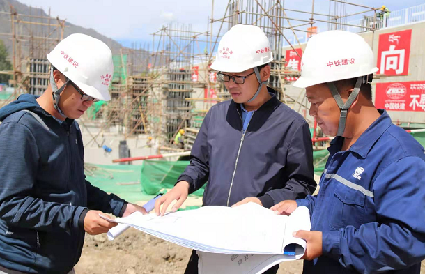 中鐵建設(shè)拉林鐵路站房項目負責人荀少謙(中)正在跟技術(shù)人員研究圖紙
