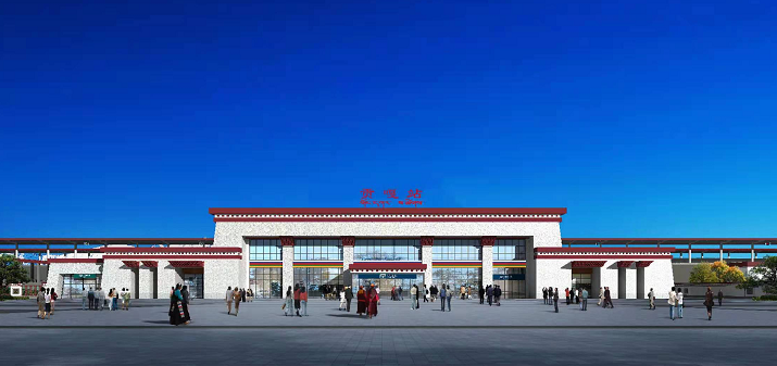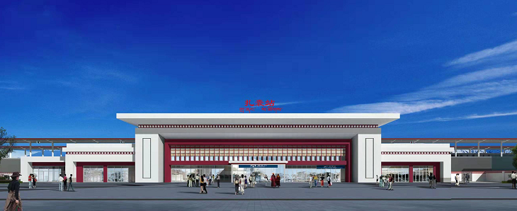 桑日站設(shè)計立意為“藏世之源,高原之美,站房整體立面外形構(gòu)成源自回首的“馬鹿”,采用現(xiàn)代建筑手法,結(jié)合藏式建筑特色,融入紅白兩色,整個建筑現(xiàn)代而不失莊嚴恢弘,凸顯出高原之美。