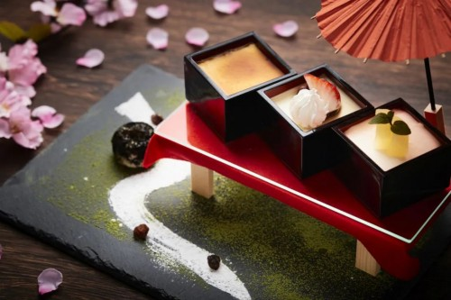 星野青森屋春季限定的賞花甜點(diǎn)一直都備受客人們青睞。今年的賞花甜點(diǎn)以當(dāng)?shù)孛谰茷樵现谱髁藙e出新意的三款美酒賞花甜點(diǎn),包括日本酒布丁、使用蘋果酒制作的蘋果酒慕斯、加入了青森葡萄酒的抹茶慕斯,又增添了一份賞花樂趣。