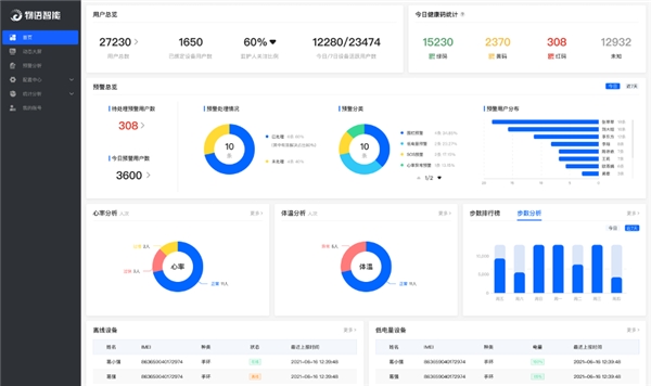 后臺業(yè)務系統(tǒng)滿足管理單位工作人員需求,可批量管理設備信息、用戶信息,自定義報警方式,報警信息處理、事件進度監(jiān)控,查看及統(tǒng)計數(shù)據報表等。