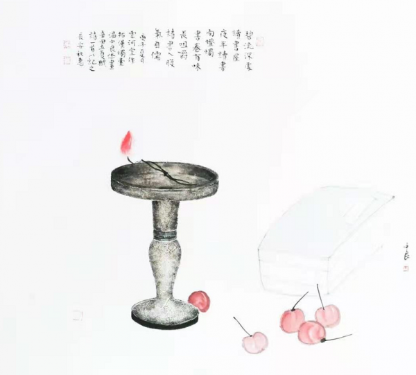 石瑞芳用“鳥語銅盤上,人思玉宇中”詩句形象概括了日本江戶時期千鳥銘文鏡展現(xiàn)的勃勃生機;徐曼娜的題賀作品對銅鏡文化詮釋精準;王江用“惟有花顏在,鮮妍花昔時”寫自己對鏡中花開花謝的感悟;岳峰的題賀作品對銅鏡文化描述準確,書法精湛,與拓片渾然一體;倪文東教授的題跋書法舒美雅致;鄧益民教授的唐仕女生動傳神,和唐代銅鏡一樣雍容華貴;王秋惠用“我有好爵,君贈秬鬯。郁香黑黍,陳年佳釀。月下獨酌,三爵不醉?;ㄇ耙髟?,心影相隨”題跋爵全形拓(秬鬯為商周時期用郁金香和黑黍釀制的酒),并配郁金香和黑黍畫作,讓沉睡幾千年的爵有了生命感。劉勇對銅鏡紋飾銘文精心研讀,題跋作品章法設計獨特。