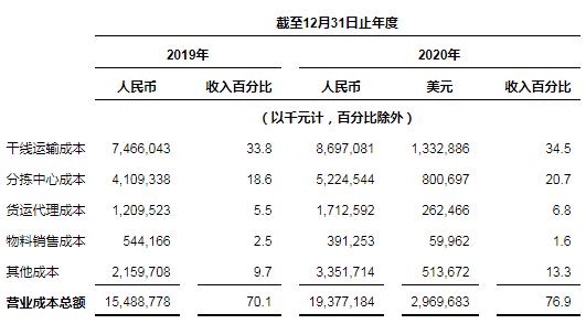 收入總額為人民幣25,214.3百萬元(3,864.3百萬美元),較去年的人民幣22,109.9百萬元增長14.0%。核心快遞服務(wù)收入增長11.9%,該增長是由于包裹量同比增長40.3%以及單票價格下降20.2%的綜合影響所致。貨運代理服務(wù)于2020年的全年收入為人民幣1,862.7百萬元(285.5百萬美元),而2019年為人民幣1,236.0百萬元。物料銷售收入主要由列印電子面單所需的熱敏紙銷售收入組成,同比增長僅4.0%,這是由于自2020年低價格的一聯(lián)電子面單使用率增加。其他收入主要由金融貸款業(yè)務(wù)和廣告服務(wù)組成。