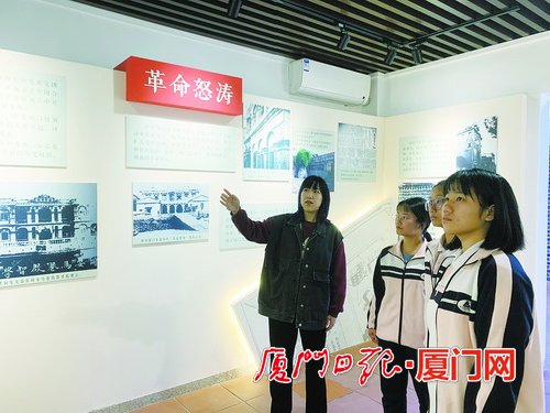 在中共閩粵贛邊區(qū)廈門市委機(jī)關(guān)舊址使命館的展廳,學(xué)生們聆聽黨史講解,看歷史圖片。(莊偉超 攝)