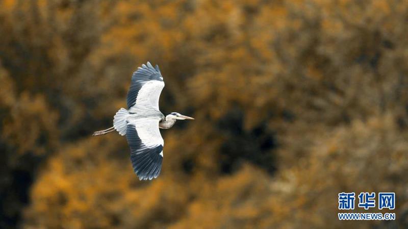 一只蒼鷺在平陸縣黃河岸邊飛舞。新華網(wǎng) 發(fā)