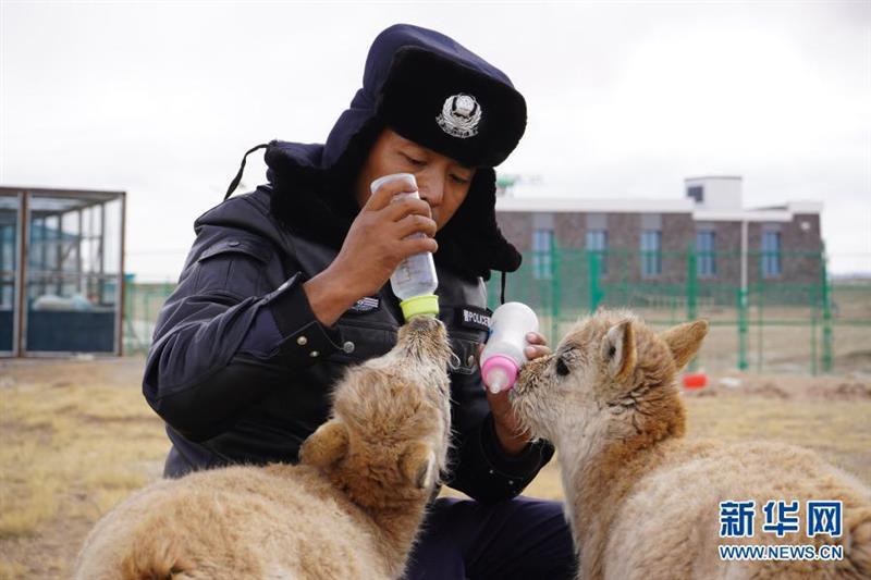 可可西里巡山隊員鄧海平給藏羚羊幼仔喂奶(12月6日攝)。
