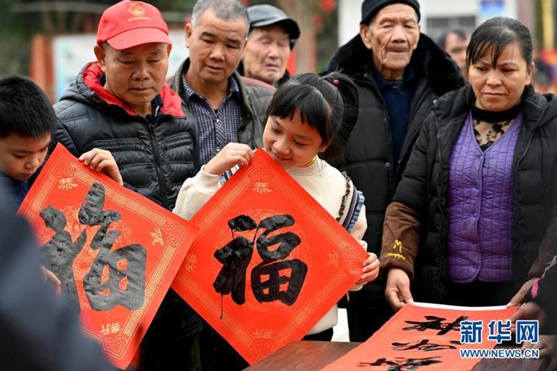 12月27日,在廣西柳州市柳江區(qū)進(jìn)德鎮(zhèn)龍新村,村民拿到志愿者贈送的福字。